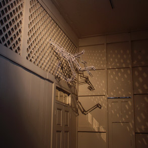 Jedsada Tangtrakulwong trained as a painter and now works with sculptural forms and site-specific practice. For Twist, the architectural details of H Project Space were studied over time with an aim of, in the artist’s words “an examination of the parts of a structure that renders that particular space different from others. Each space has its own character. I use the distinctive parts of a space as the starting point.” Twist is a subtle installation prompted by the structural lattice feature of H Project Space, a natural air vent for the room. Tangtrakulwong considered its proximity to the ceiling and consequently noticed the typically unnoticed traces of spiders and their webs. Seeing a correspondence between these forms and the diagonal, diamond shapes of the lattice, the artist has created complex structures that are integrated with the architecture while seemingly trying to break free. The cool architectural elegance of H Project Space is simultaneously announced and disrupted by Twist. Tangtrakulwong’s intervention allows for the contemplation of formal beauty while hinting at a melancholic sense of time passing and hidden histories of life and fragility.Jedsada Tangtrakulwong is a graduate of the San Francisco Art Institute and holds a MFA (Distinction) from the Slade School of Fine Art in London. He is a lecturer in the Faculty of Fine and Applied Arts at Mahasarakham University in the Northeast of Thailand and exhibits internationally. Tangtrakulwong recently completed a residency in the Yunnan, China and was awarded an Asia Pacific Artist Fellowship 2009 at the National Museum of Contemporary Art in Korea. |